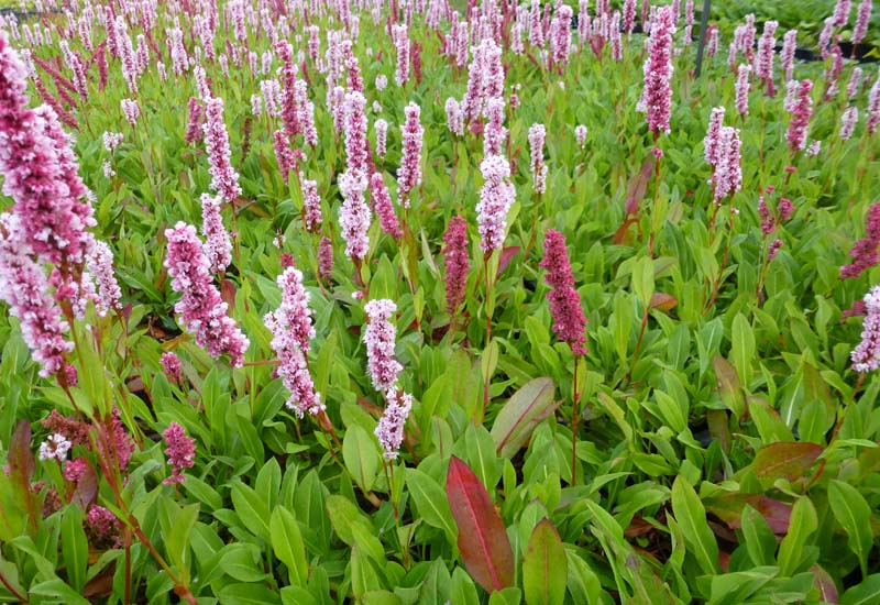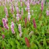 A low spreading plant, good for ground cover, that produces short pink pokers of small flowers that turn brick red with age. Below the spikes, which sit on slender stems, is a carpet of very dark, slim leaves. Flowers July – September