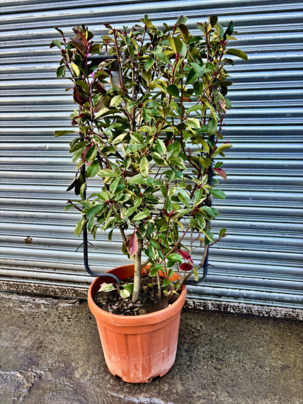 Photinia × fraseri ‘Louise’ in espalier form is a striking solution for adding colour, structure, and year-round interest to walls, fences, and screens. Trained flat against a support, ‘Louise’ creates a living panel of narrow, lance-shaped leaves boldly edged in cream and splashed with green, while new shoots emerge in vivid shades of pink and red. The combination of variegation and fresh pink growth ensures a dynamic, multi-tonal display through every season.