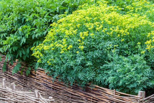 Ruta graveolens or ‘rue’ is a small perennial shrub of about 1 meter. Widely use as a culinary and medicinal herb either dried or fresh. With clusters of four petaled yellow flowers in the summer and highly aromatic leaves. Perfect for beds, borders and planters. Grow in a well drained soil in full sun or partial shade