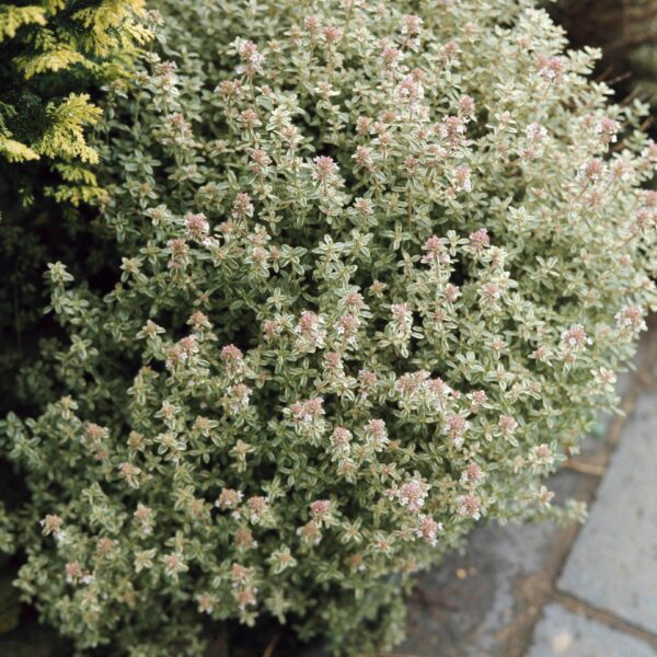 Thymus vulgaris ‘Argenteus’, commonly known as silver thyme, is a compact, evergreen perennial herb with variegated green and silver foliage, giving it a striking ornamental appeal. It forms a low-growing, bushy mound, typically reaching 15 to 25 cm in height, making it ideal for rock gardens, borders, and containers. In summer, it produces tiny, rose-pink flowers, which attract bees and butterflies, enhancing its value in pollinator-friendly gardens. The lemon-scented leaves are highly aromatic and can be used in culinary dishes, adding a subtle citrus note to meats, vegetables, and sauces. Thriving in well-drained, sandy or rocky soils, it prefers full sun and is drought-tolerant, making it an excellent choice for Mediterranean-style landscapes. With its hardy nature and year-round interest, silver thyme is both a practical and decorative addition to any garden
